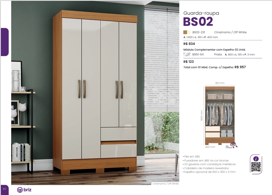 Roupeiro 4 Portas 161 | Politorno 0226 S/Espelho 1310,00 E Versão C/Espelho 1630,00
